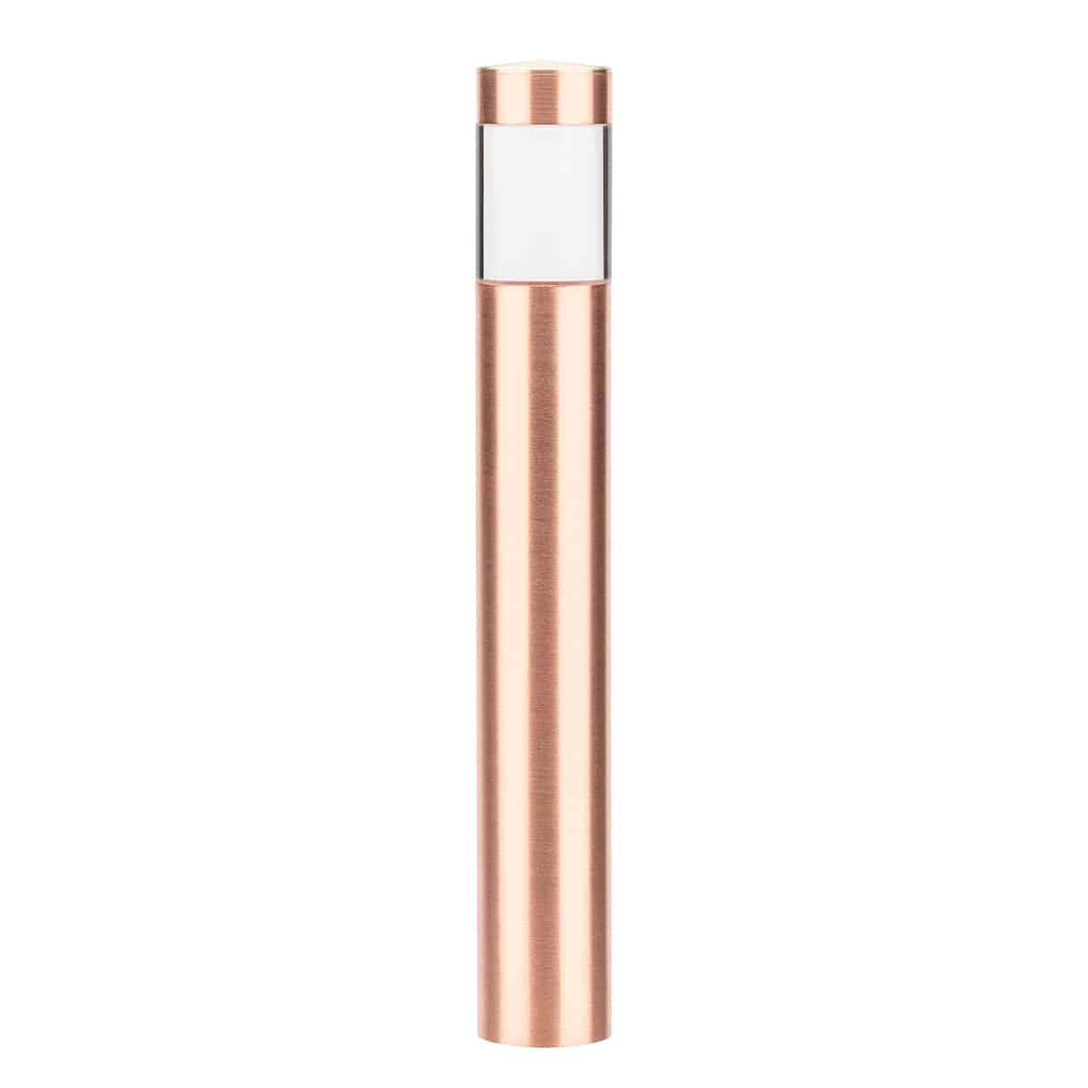 For the illumination of pathways and horizontal lighting, this low-voltage bollard fixture is constructed of a heavy-gauge, extruded, solid copper post fitted to a precision CNC-machined, solid brass cap. A clear, machined, fiber-optic quality acrylic lens is fitted to the housing with a silicone gasket to ensure a superior weather-tight seal.