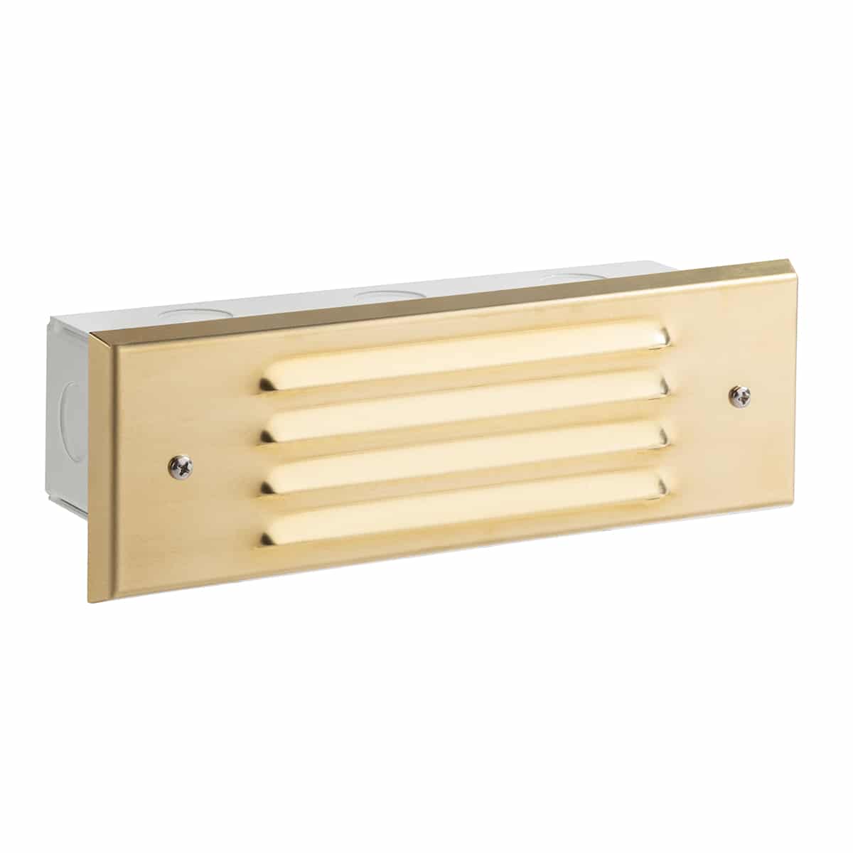 Recessed within the elements of steps or walls for low-level area lighting, this low voltage louvered face brick light fixture is constructed of a stamped and formed, copper-free, aluminum housing with ½” knockouts on the back and sides. A stamped solid copper cover plate is fitted with UV-resistant weather stripping to ensure a superior weather-tight seal. A translucent, high-impact, polycarbonate lens safeguards the lamp and optics.