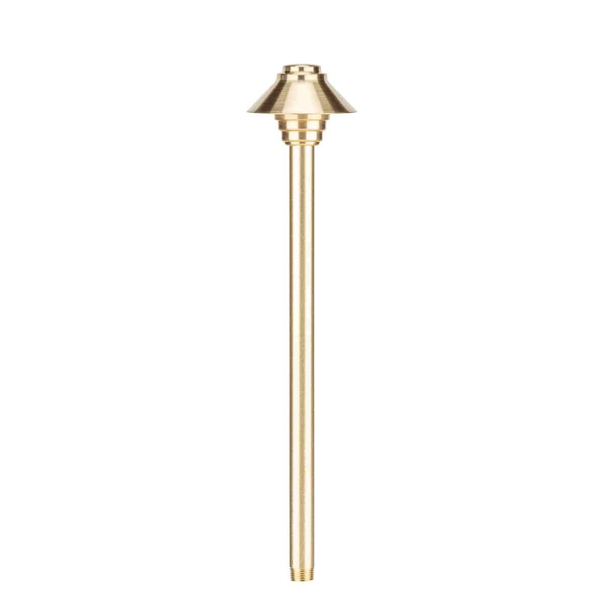 For accenting low flower beds or illuminating pathways, this low voltage path light fixture is constructed of solid spun brass. Vista’s Turn-To-Lock solid brass lamp base makes lamp maintenance simple and tool-free. The stem is a ½” heavy-gauge, extruded, solid brass pipe with a ½” NPT. A wave shaped, textured “Panoramic Plus” Tuffak® lens maximizes light transmittance while safeguarding the lamp and optics.