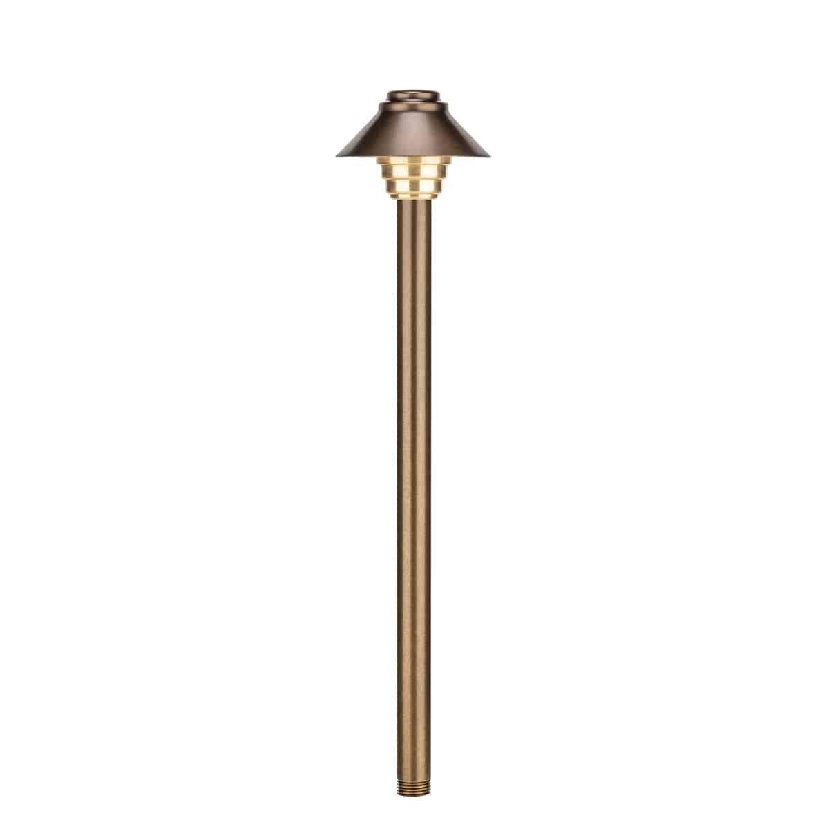For accenting low flower beds or illuminating pathways, this low voltage path light fixture is constructed of solid spun brass. Vista’s Turn-To-Lock solid brass lamp base makes lamp maintenance simple and tool-free. The stem is a ½” heavy-gauge, extruded, solid brass pipe with a ½” NPT. A wave shaped, textured “Panoramic Plus” Tuffak® lens maximizes light transmittance while safeguarding the lamp and optics.