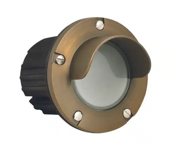 Description: Brass Hooded Step Light with Frosted Lens