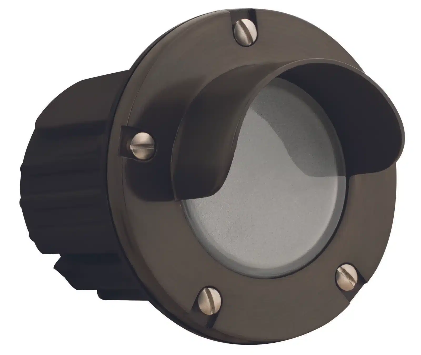 Step Light with a Brass Hooded Faceplate and Frosted Lens, Housed in an Injection-molded Composite Base, Finished in Antique Bronze or Gun Metal.