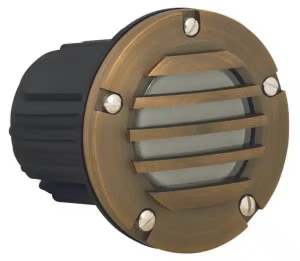 Step Light with a Brass Louvered Faceplate and Frosted Lens, housed in an Injection-molded Composite Base Finished in Antique Bronze or Gun Metal.