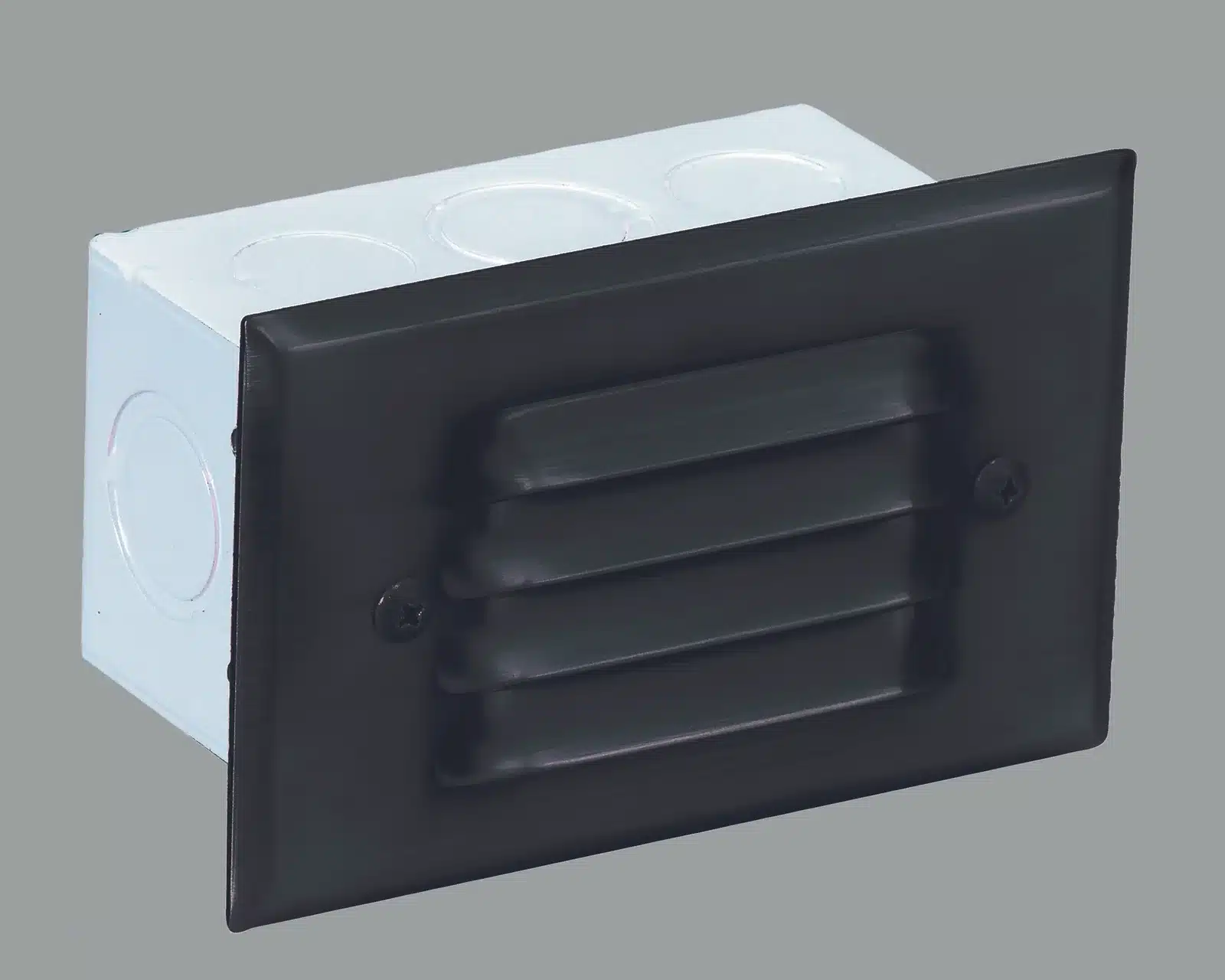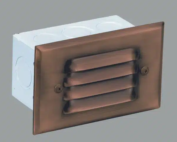 Aluminum 4-louver Step Light with a white powder coated steel mount box. Faceplate finished in Black, Bronze, White or Sliver Plated.