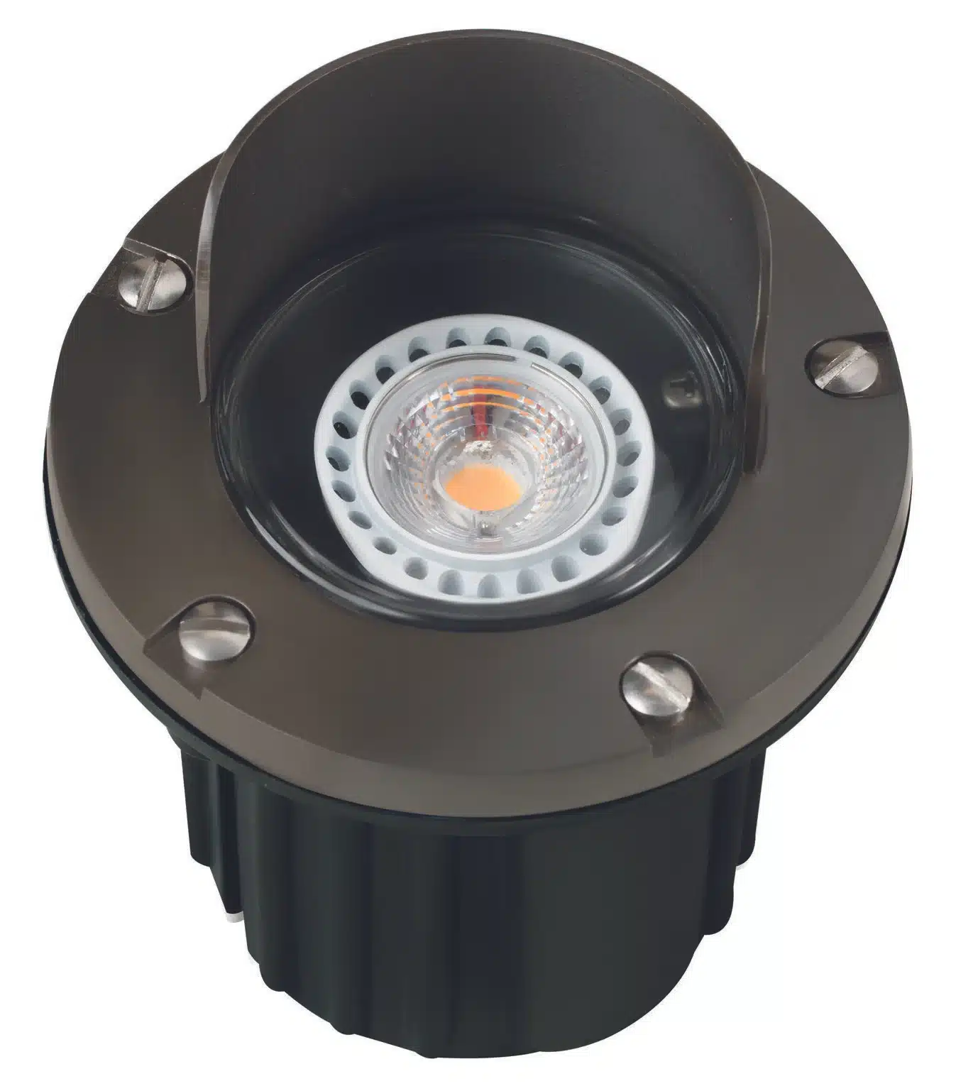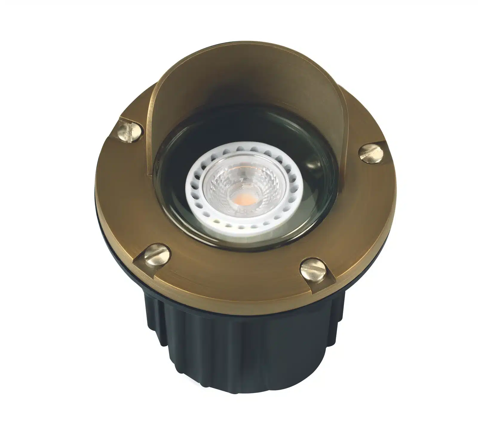 Cast Brass Hooded Well Light Housed with a Black Injection-molded Composite Base Finished in Antique Bronze or Gun Metal.