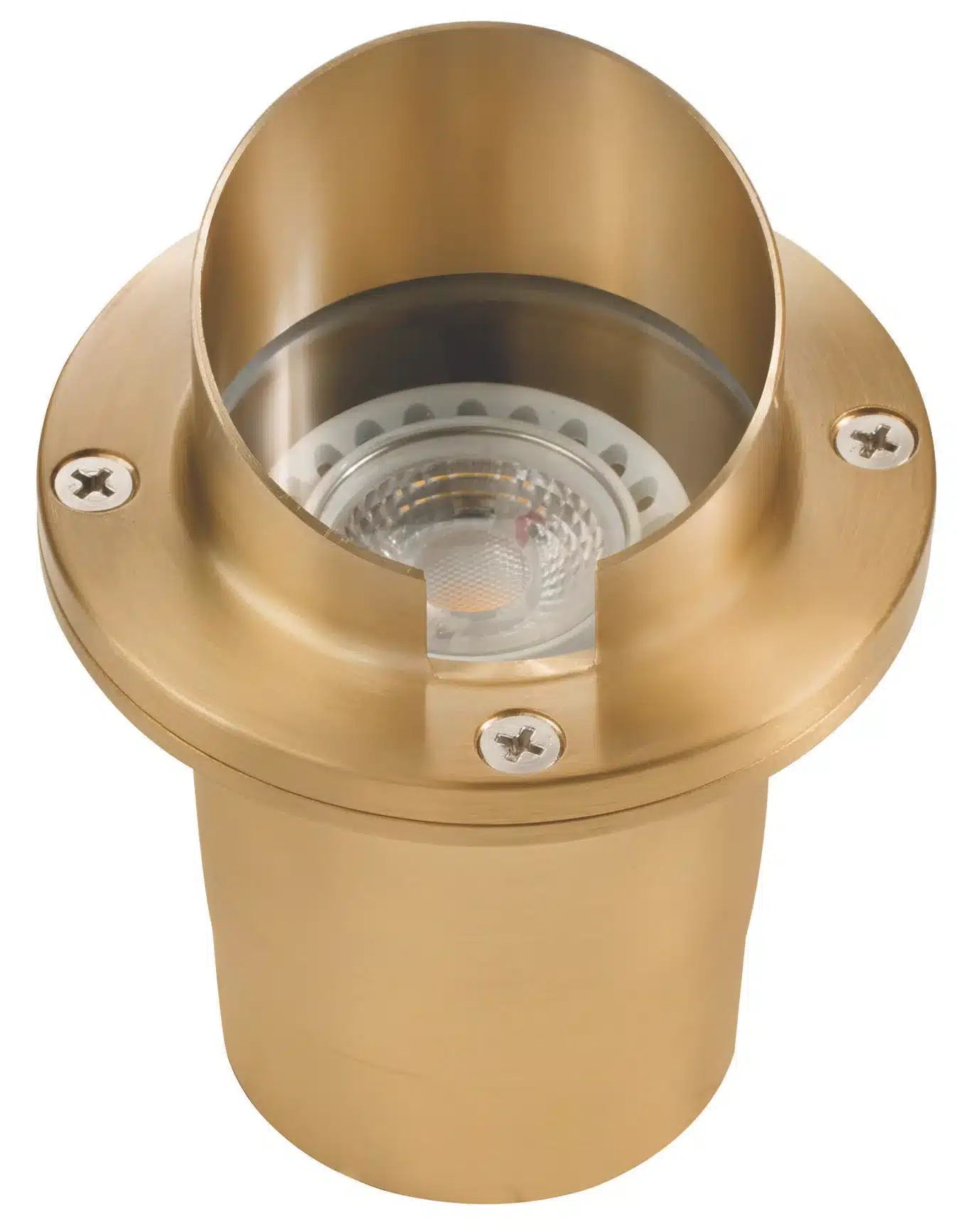 Hooded Well Light housed in Aluminum, Composite or Natural Brass. Finished in a Black or Natural Brass.